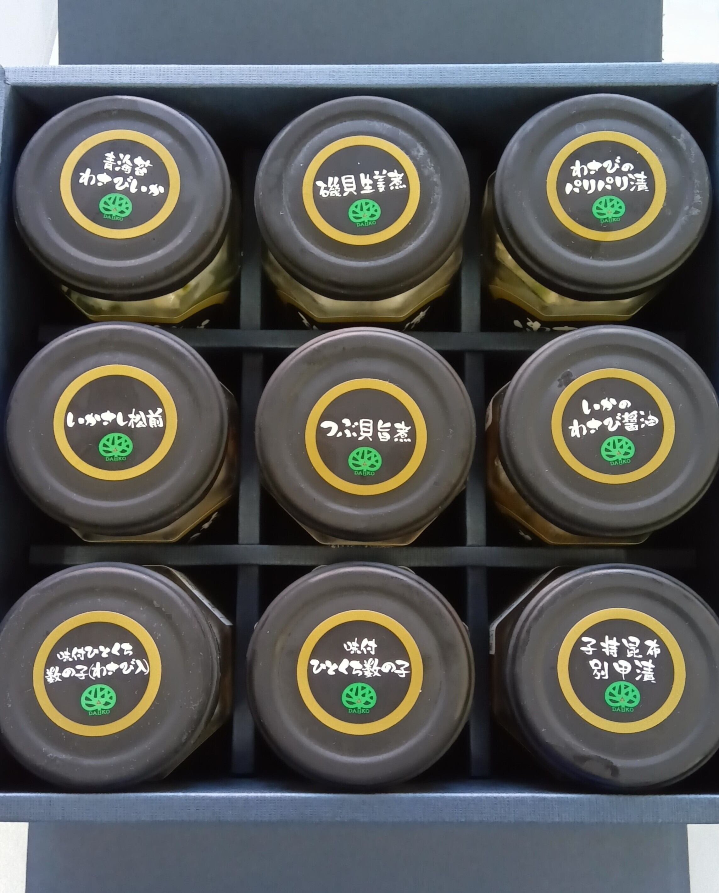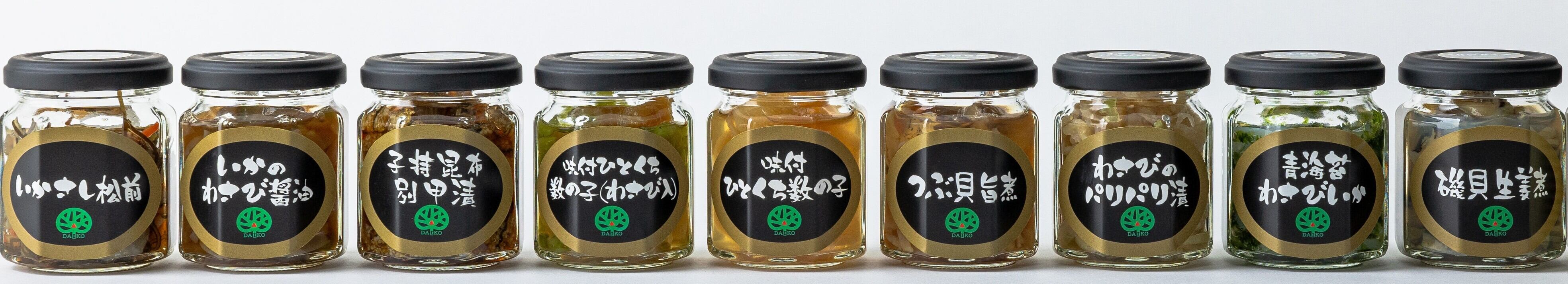 つぶ貝旨煮、磯貝生姜煮、いかのわさび?油、子持昆布別甲漬、各100g×1本